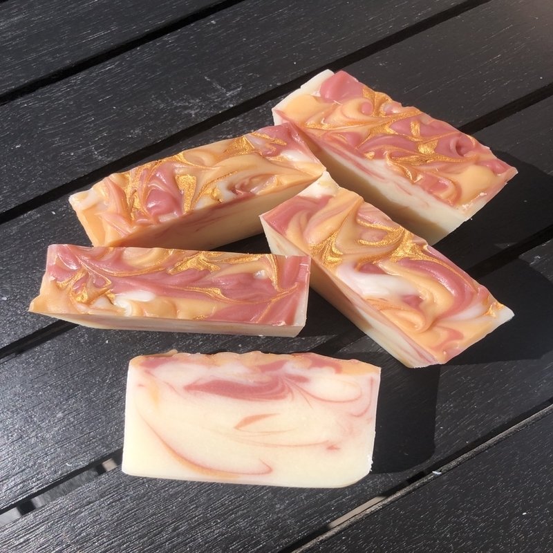 Ingredients: Coconut Oil, Olive Oil, Shea Butter, Rice Bran Oil, Castor Oil, Sodium Hydroxide, Water, Mica, Rose Geranium Orange & Ylang Ylnag Essential Oils.