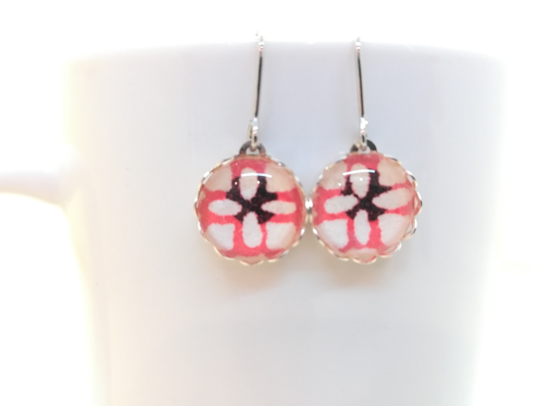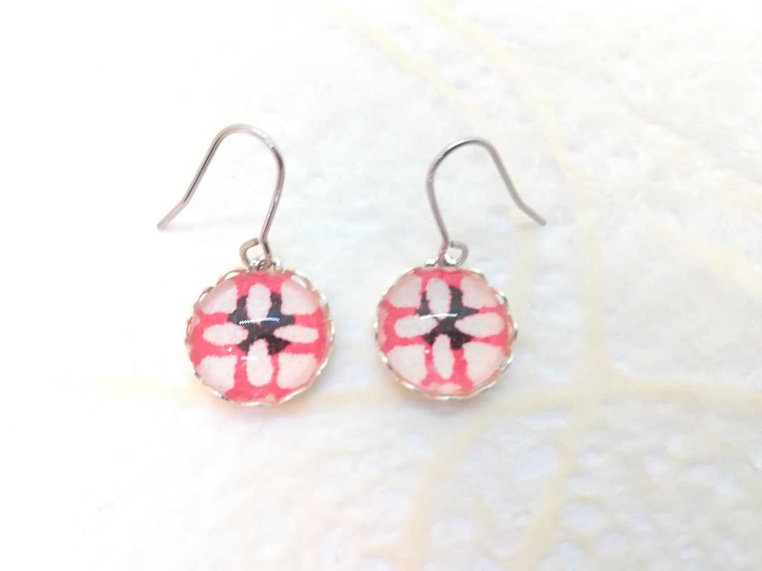 Handmade Round dangle earrings with Japanese traditional “Washi” paper covered by dome glasses.