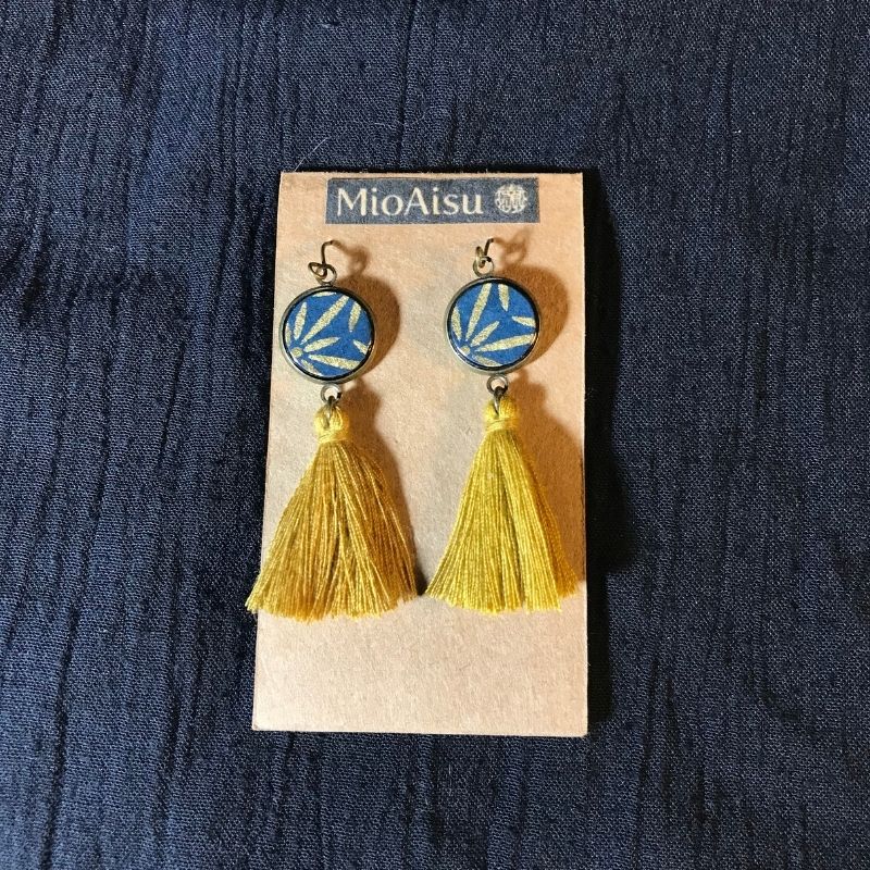 This listing is for one pair of short mustard yellow tassel earrings(cotton threads) with navy and gold pattern. They are handmade with Japanese Washi paper that is placed on a 1.4cm circle laser cut MDF. The piece is finished off with a layer of resin and* waterproof.