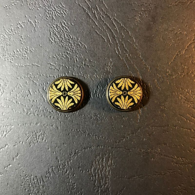 This listing is for one pair of 1.4cm stud earrings with black and gold patterns. They are handmade with Japanese Washi paper that is placed on a 1.4cm circle laser cut MDF. The piece is set in a beautiful antique brass bezel with studs and finished off with a layer of resin and* waterproof.